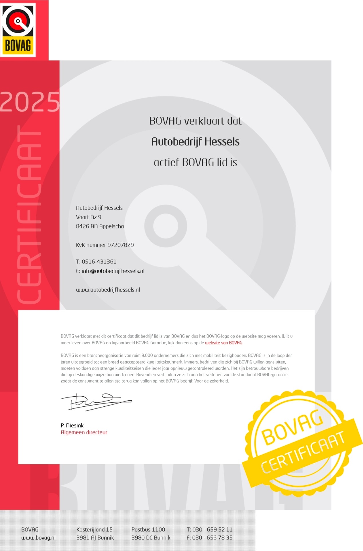 Als u op zoek bent naar een autobedrijf waar betrouwbaarheid, vakmanschap en service vanzelfsprekend zijn, dan bent u bij Autobedrijf Hessels aan het juiste adres. Onze BOVAG-erkenning is een officieel keurmerk dat onderstreept dat wij professioneel en klantgericht werken — uw auto is in goede handen bij ons.